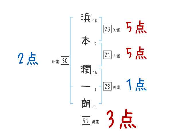 人運![]() | 浜本潤一朗さんの人運は21画の5つ星!統率力がある。独立し成功する。名誉を手に入れる。 性格や才能などを表す2番目に重要な運勢です。人間関係や協調性、社会的な成功に影響します。主に20歳から50歳ぐらいまでの中年期の運勢を表します。 |