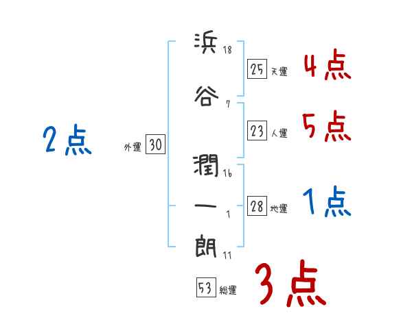 総運![]() | 浜谷潤一朗さんの総運は53画の3つ星!やや見栄っ張りで虚栄心がある。散財に注意。 あなたの人生を表す1番重要な運勢です。生涯を通じて影響する総合運となり、主に50歳以降の晩年期に影響を及ぼします。 |