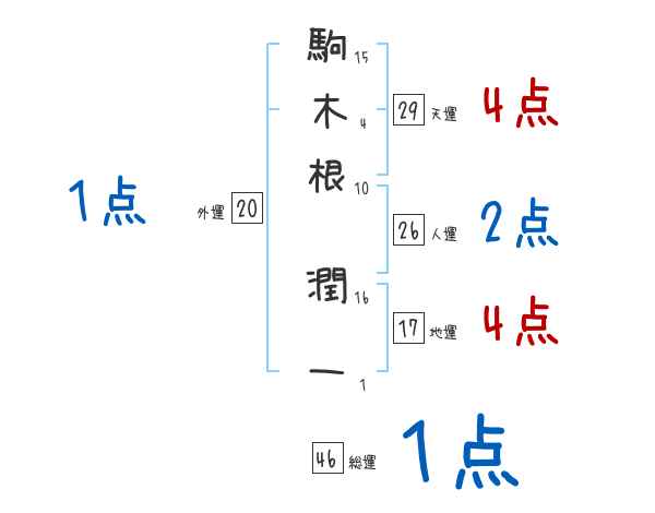 総運![]() | 駒木根潤一さんの総運は46画の1つ星!迷走することが多く苦労するかも。目先のことにとらわれないように。 あなたの人生を表す1番重要な運勢です。生涯を通じて影響する総合運となり、主に50歳以降の晩年期に影響を及ぼします。 |