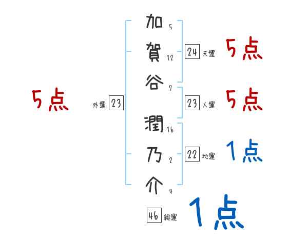 外運![]() | 加賀谷潤乃介さんの外運は23画の5つ星!想像力に優れ活力がある。一代で成功し名誉を手に入れる。 生活面を象徴する運勢です。外部から受ける影響力を表し、結婚運、家庭運や職場、環境への順応性を表します。 |