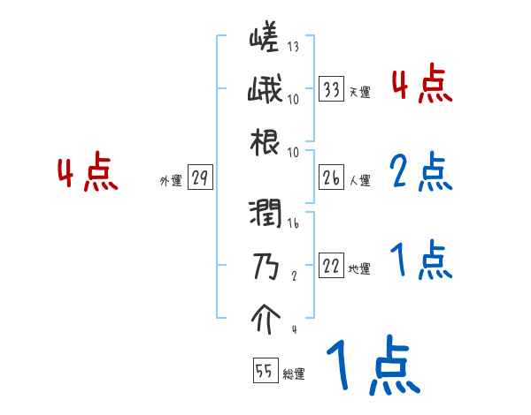 嵯峨根潤乃介さんの総運は55画の1つ星