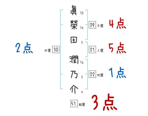 天運![]() | 眞榮田潤乃介さんの天運は29画の4つ星!完全主義で才能がある。厳格な心の持ち主。 家系が持つ宿命的な運勢を表します。祖先から受け継いだ苗字ですので自分の力が及びません。家柄を象徴します。 |