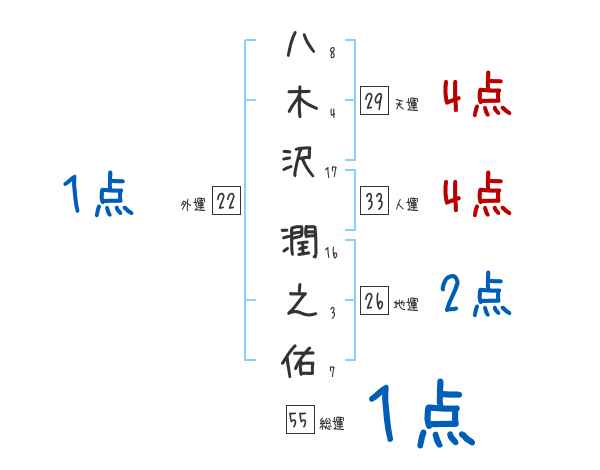 外運![]() | 八木沢潤之佑さんの外運は22画の1つ星!努力することが苦手ないっぽう手先が器用。芸術性にも優れる。 生活面を象徴する運勢です。外部から受ける影響力を表し、結婚運、家庭運や職場、環境への順応性を表します。 |