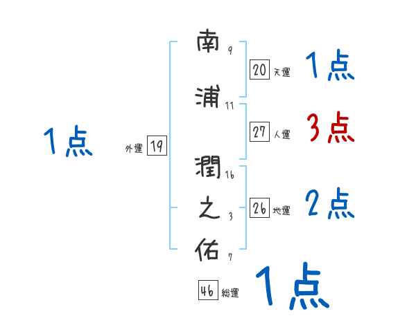 外運![]() | 南浦潤之佑さんの外運は19画の1つ星!優れた才能を持ちますが、協調性が足りないことも。周りの人と協力する事を意識しましょう。 生活面を象徴する運勢です。外部から受ける影響力を表し、結婚運、家庭運や職場、環境への順応性を表します。 |