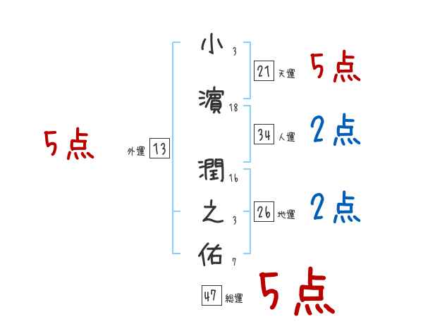 総運![]() | 小濵潤之佑さんの総運は47画の5つ星!実力が開花し発展する円満な人生。財に恵まれる。 あなたの人生を表す1番重要な運勢です。生涯を通じて影響する総合運となり、主に50歳以降の晩年期に影響を及ぼします。 |