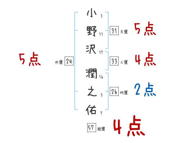 天運![]() | 小野沢潤之佑さんの天運は31画の5つ星!社交性があり判断力に優れる。順風満帆な人生で円満な生活。 家系が持つ宿命的な運勢を表します。祖先から受け継いだ苗字ですので自分の力が及びません。家柄を象徴します。 |