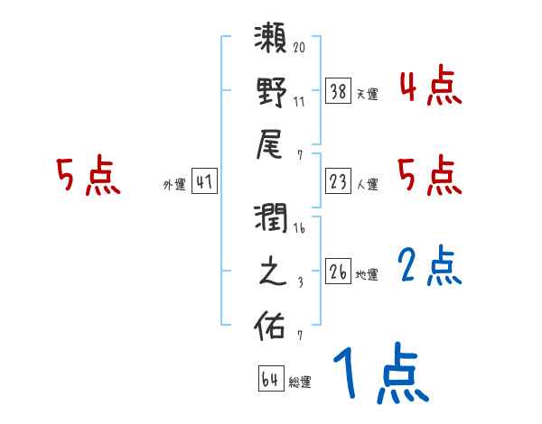 外運![]() | 瀬野尾潤之佑さんの外運は41画の5つ星!大志を抱き、目標に向かって実力を発揮し達成する。温和な性格。 生活面を象徴する運勢です。外部から受ける影響力を表し、結婚運、家庭運や職場、環境への順応性を表します。 |