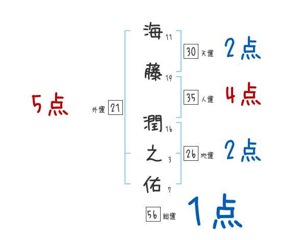 天運![]() | 海藤潤之佑さんの天運は30画の2つ星!浮き沈みの激しさに注意しましょう。 家系が持つ宿命的な運勢を表します。祖先から受け継いだ苗字ですので自分の力が及びません。家柄を象徴します。 |