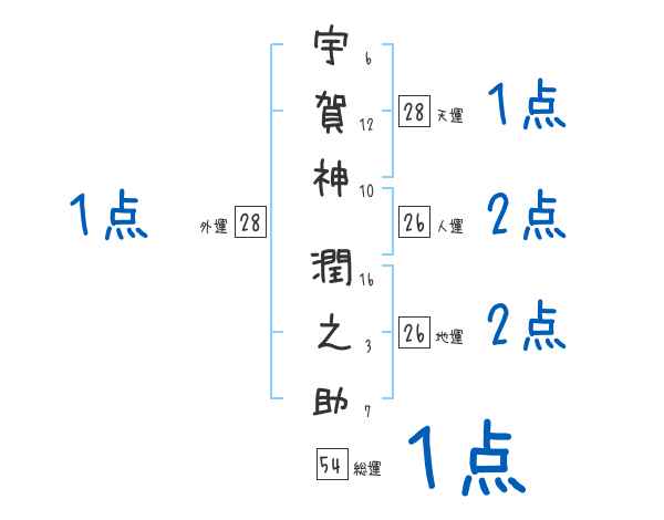 | 外運  | 宇賀神潤之助さんの外運は28画の1つ星!家庭環境に注意。スポーツで活躍できる能力があるかも。生活面を象徴する運勢です。外部から受ける影響力を表し、結婚運、家庭運や職場、環境への順応性を表します。 |