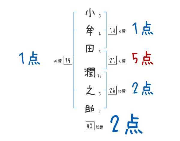 外運![]() | 小牟田潤之助さんの外運は19画の1つ星!優れた才能を持ちますが、協調性が足りないことも。周りの人と協力する事を意識しましょう。 生活面を象徴する運勢です。外部から受ける影響力を表し、結婚運、家庭運や職場、環境への順応性を表します。 |