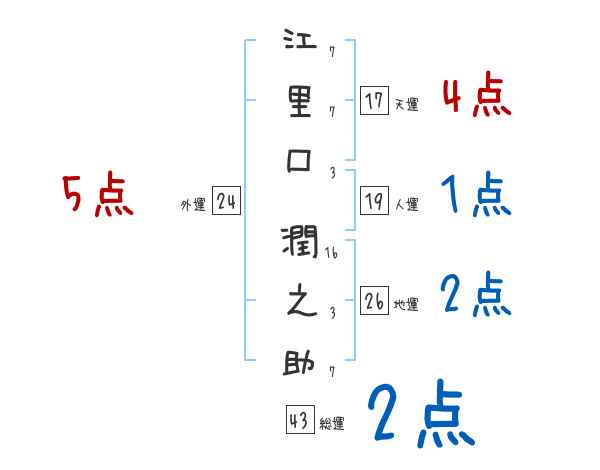 外運![]() | 江里口潤之助さんの外運は24画の5つ星!家庭運が良く順調な人生。金運にも恵まれる。 生活面を象徴する運勢です。外部から受ける影響力を表し、結婚運、家庭運や職場、環境への順応性を表します。 |