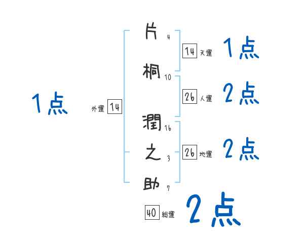 地運![]() | 片桐潤之助さんの地運は26画の2つ星!波瀾万丈かも。信頼できる人を大事にしましょう。 個性を表す基礎的な運勢です。性格形成や対人関係、行動力など家庭環境に影響されます。主に誕生してから20歳くらいまでの若年期の運勢を表します。 |