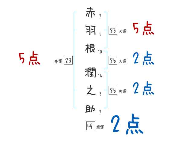 天運![]() | 赤羽根潤之助さんの天運は23画の5つ星!想像力に優れ活力がある。一代で成功し名誉を手に入れる。 家系が持つ宿命的な運勢を表します。祖先から受け継いだ苗字ですので自分の力が及びません。家柄を象徴します。 |