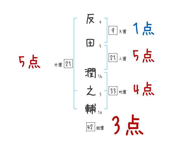 外運![]() | 反田潤之輔さんの外運は21画の5つ星!統率力がある。独立し成功する。名誉を手に入れる。 生活面を象徴する運勢です。外部から受ける影響力を表し、結婚運、家庭運や職場、環境への順応性を表します。 |