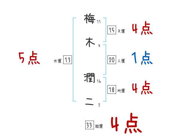 総運![]() | 梅木潤二さんの総運は33画の4つ星!権力志向でプライドが高い。勇気があり運を切り開き成功する。 あなたの人生を表す1番重要な運勢です。生涯を通じて影響する総合運となり、主に50歳以降の晩年期に影響を及ぼします。 |
