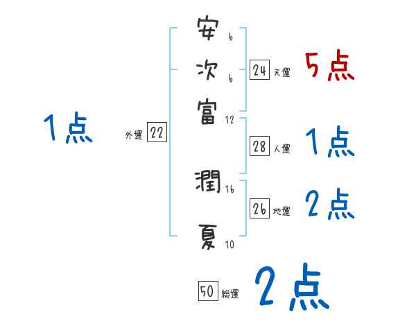天運![]() | 安次富潤夏さんの天運は24画の5つ星!家庭運が良く順調な人生。金運にも恵まれる。 家系が持つ宿命的な運勢を表します。祖先から受け継いだ苗字ですので自分の力が及びません。家柄を象徴します。 |
