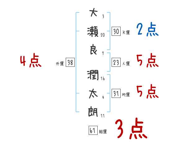 外運![]() | 大瀬良潤太朗さんの外運は38画の4つ星!温厚な性格で技術的な才能を発揮する。職人的な仕事に向いている。 生活面を象徴する運勢です。外部から受ける影響力を表し、結婚運、家庭運や職場、環境への順応性を表します。 |