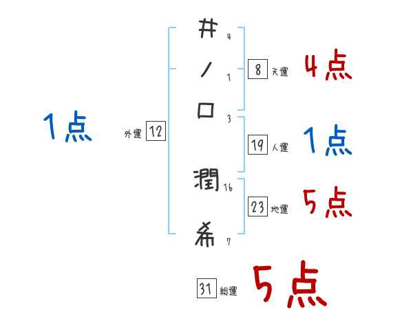 天運![]() | 井ノ口潤希さんの天運は8画の4つ星!勤勉家。根気強く努力し成功する。忍耐力がある。 家系が持つ宿命的な運勢を表します。祖先から受け継いだ苗字ですので自分の力が及びません。家柄を象徴します。 |
