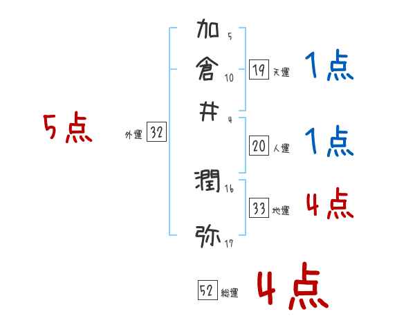 外運![]() | 加倉井潤弥さんの外運は32画の5つ星!柔軟性があり成功する。チャンスが多く金運が良い。 生活面を象徴する運勢です。外部から受ける影響力を表し、結婚運、家庭運や職場、環境への順応性を表します。 |