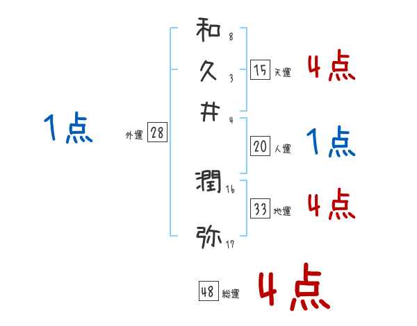 総運![]() | 和久井潤弥さんの総運は48画の4つ星!賢明な性格で人望が厚い。指導力があり多くの人に尊敬される。 あなたの人生を表す1番重要な運勢です。生涯を通じて影響する総合運となり、主に50歳以降の晩年期に影響を及ぼします。 |
