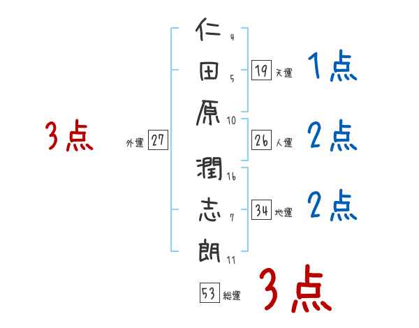 総運![]() | 仁田原潤志朗さんの総運は53画の3つ星!やや見栄っ張りで虚栄心がある。散財に注意。 あなたの人生を表す1番重要な運勢です。生涯を通じて影響する総合運となり、主に50歳以降の晩年期に影響を及ぼします。 |
