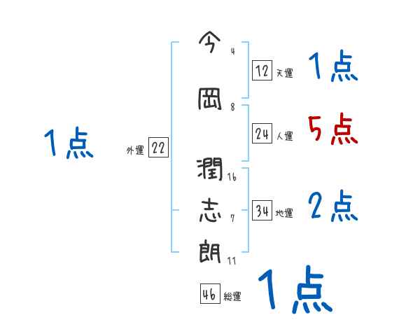 外運![]() | 今岡潤志朗さんの外運は22画の1つ星!努力することが苦手ないっぽう手先が器用。芸術性にも優れる。 生活面を象徴する運勢です。外部から受ける影響力を表し、結婚運、家庭運や職場、環境への順応性を表します。 |