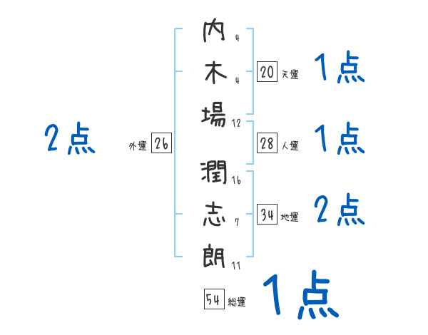 外運![]() | 内木場潤志朗さんの外運は26画の2つ星!波瀾万丈かも。信頼できる人を大事にしましょう。 生活面を象徴する運勢です。外部から受ける影響力を表し、結婚運、家庭運や職場、環境への順応性を表します。 |