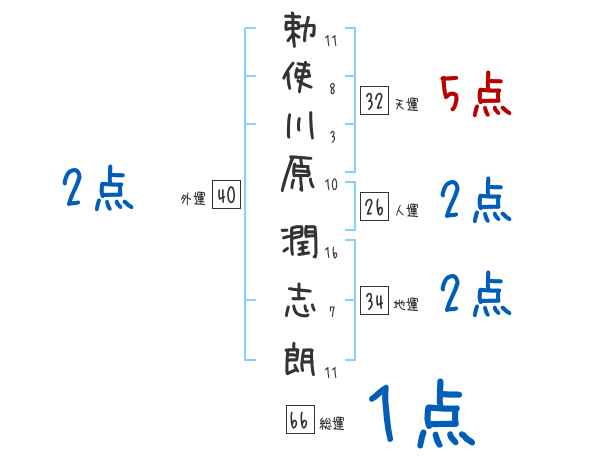天運![]() | 勅使川原潤志朗さんの天運は32画の5つ星!柔軟性があり成功する。チャンスが多く金運が良い。 家系が持つ宿命的な運勢を表します。祖先から受け継いだ苗字ですので自分の力が及びません。家柄を象徴します。 |