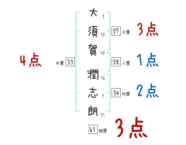 外運![]() | 大須賀潤志朗さんの外運は33画の4つ星!権力志向でプライドが高い。勇気があり運を切り開き成功する。 生活面を象徴する運勢です。外部から受ける影響力を表し、結婚運、家庭運や職場、環境への順応性を表します。 |
