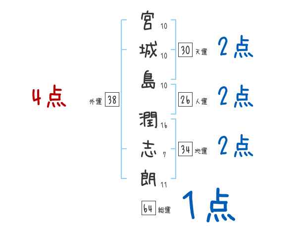 天運![]() | 宮城島潤志朗さんの天運は30画の2つ星!浮き沈みの激しさに注意しましょう。 家系が持つ宿命的な運勢を表します。祖先から受け継いだ苗字ですので自分の力が及びません。家柄を象徴します。 |