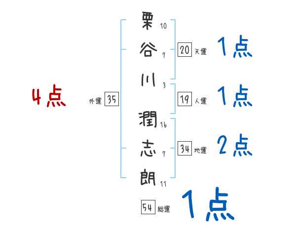 外運![]() | 栗谷川潤志朗さんの外運は35画の4つ星!温厚な性格で感受性が高い。穏和な性格で人望が厚い。 生活面を象徴する運勢です。外部から受ける影響力を表し、結婚運、家庭運や職場、環境への順応性を表します。 |