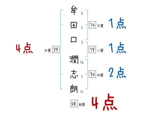 外運![]() | 牟田口潤志朗さんの外運は29画の4つ星!完全主義で才能がある。厳格な心の持ち主。 生活面を象徴する運勢です。外部から受ける影響力を表し、結婚運、家庭運や職場、環境への順応性を表します。 |