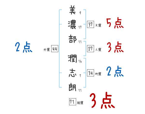 外運![]() | 美濃部潤志朗さんの外運は44画の2つ星!誠実で慎重な性格。物事を考えすぎないように注意しましょう。 生活面を象徴する運勢です。外部から受ける影響力を表し、結婚運、家庭運や職場、環境への順応性を表します。 |