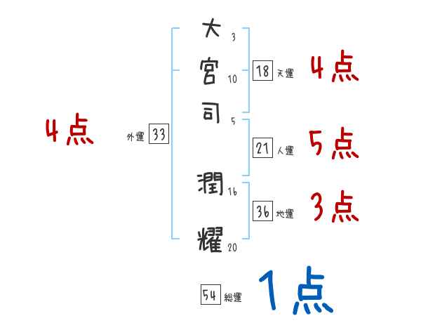 外運![]() | 大宮司潤耀さんの外運は33画の4つ星!権力志向でプライドが高い。勇気があり運を切り開き成功する。 生活面を象徴する運勢です。外部から受ける影響力を表し、結婚運、家庭運や職場、環境への順応性を表します。 |