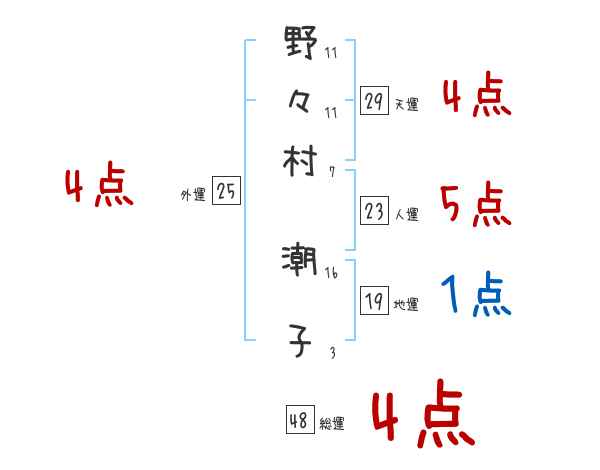 天運![]() | 野々村潮子さんの天運は29画の4つ星!完全主義で才能がある。厳格な心の持ち主。 家系が持つ宿命的な運勢を表します。祖先から受け継いだ苗字ですので自分の力が及びません。家柄を象徴します。 |