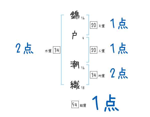 外運![]() | 錦戸潮織さんの外運は34画の2つ星!独創性に優れるが、自尊心が強く災難に注意しましょう。 生活面を象徴する運勢です。外部から受ける影響力を表し、結婚運、家庭運や職場、環境への順応性を表します。 |