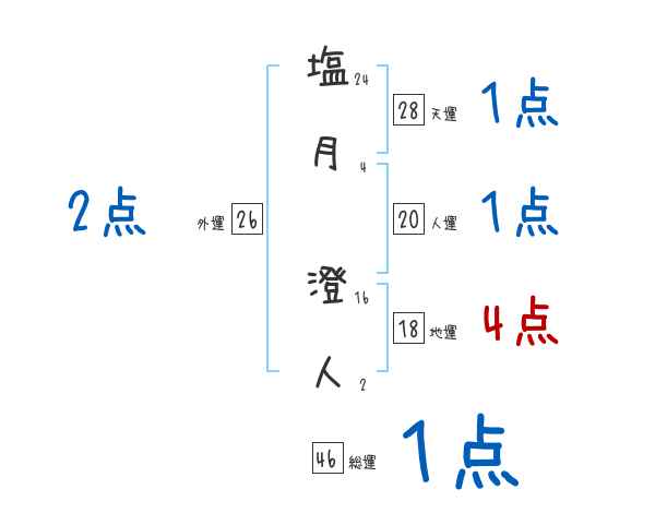 天運![]() | 塩月澄人さんの天運は28画の1つ星!家庭環境に注意。スポーツで活躍できる能力があるかも。 家系が持つ宿命的な運勢を表します。祖先から受け継いだ苗字ですので自分の力が及びません。家柄を象徴します。 |