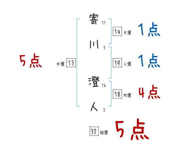 総運![]() | 寄川澄人さんの総運は32画の5つ星!柔軟性があり成功する。チャンスが多く金運が良い。 あなたの人生を表す1番重要な運勢です。生涯を通じて影響する総合運となり、主に50歳以降の晩年期に影響を及ぼします。 |
