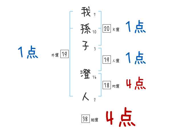 人運![]() | 我孫子澄人さんの人運は19画の1つ星!優れた才能を持ちますが、協調性が足りないことも。周りの人と協力する事を意識しましょう。 性格や才能などを表す2番目に重要な運勢です。人間関係や協調性、社会的な成功に影響します。主に20歳から50歳ぐらいまでの中年期の運勢を表します。 |