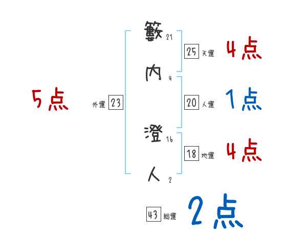 総運![]() | 籔内澄人さんの総運は43画の2つ星!頑固な性格で独立心が強いかも。やや非現実的で浪費に注意しましょう。 あなたの人生を表す1番重要な運勢です。生涯を通じて影響する総合運となり、主に50歳以降の晩年期に影響を及ぼします。 |