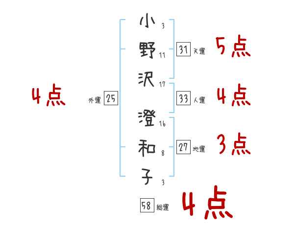 天運![]() | 小野沢澄和子さんの天運は31画の5つ星!社交性があり判断力に優れる。順風満帆な人生で円満な生活。 家系が持つ宿命的な運勢を表します。祖先から受け継いだ苗字ですので自分の力が及びません。家柄を象徴します。 |