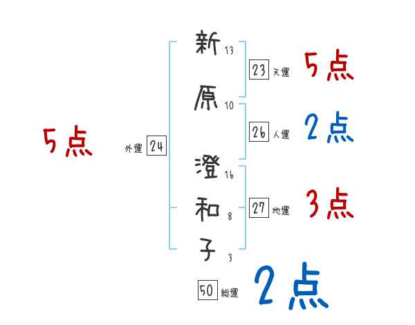 外運![]() | 新原澄和子さんの外運は24画の5つ星!家庭運が良く順調な人生。金運にも恵まれる。 生活面を象徴する運勢です。外部から受ける影響力を表し、結婚運、家庭運や職場、環境への順応性を表します。 |