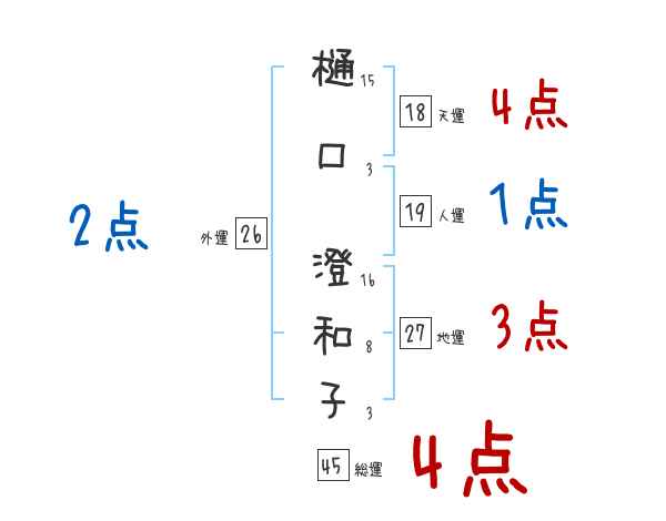 天運![]() | 樋口澄和子さんの天運は18画の4つ星!情熱的で剛気。忍耐力があり信頼される。 家系が持つ宿命的な運勢を表します。祖先から受け継いだ苗字ですので自分の力が及びません。家柄を象徴します。 |