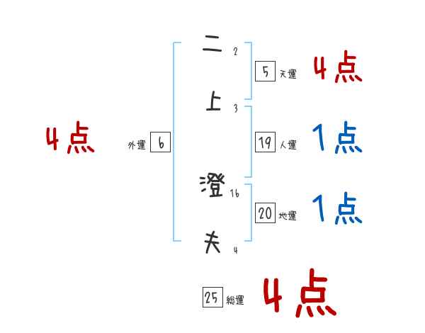 天運![]() | 二上澄夫さんの天運は5画の4つ星!健康で安泰。協調性に優れ、財産に恵まれる。 家系が持つ宿命的な運勢を表します。祖先から受け継いだ苗字ですので自分の力が及びません。家柄を象徴します。 |
