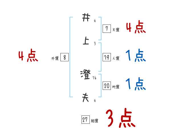 天運![]() | 井上澄夫さんの天運は7画の4つ星!強い意志や信念を持ち独立心が強い。自立する。 家系が持つ宿命的な運勢を表します。祖先から受け継いだ苗字ですので自分の力が及びません。家柄を象徴します。 |
