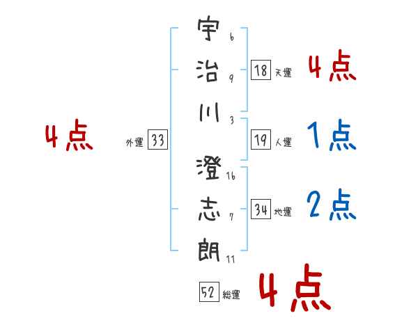 外運![]() | 宇治川澄志朗さんの外運は33画の4つ星!権力志向でプライドが高い。勇気があり運を切り開き成功する。 生活面を象徴する運勢です。外部から受ける影響力を表し、結婚運、家庭運や職場、環境への順応性を表します。 |