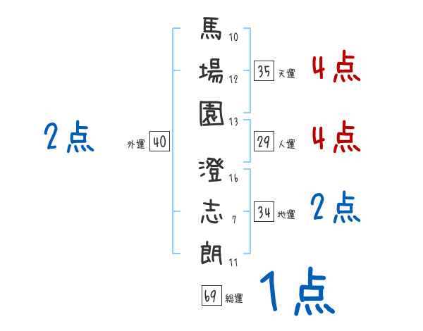 総運![]() | 馬場園澄志朗さんの総運は69画の1つ星!不満を感じやすい傾向が。ストレスを貯めないように注意しましょう。 あなたの人生を表す1番重要な運勢です。生涯を通じて影響する総合運となり、主に50歳以降の晩年期に影響を及ぼします。 |