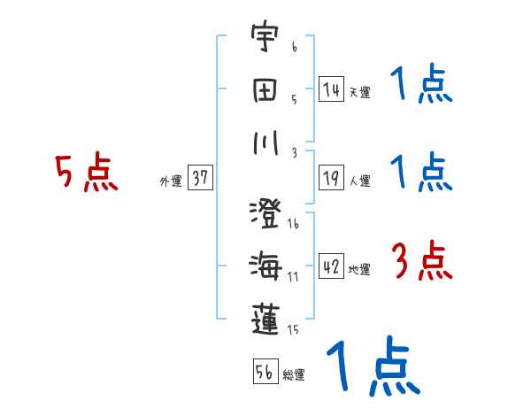 天運![]() | 宇田川澄海蓮さんの天運は14画の1つ星!人に対して優しいがストレスを溜め込みがち。人間関係のトラブルを避けるよう気をつけましょう。 家系が持つ宿命的な運勢を表します。祖先から受け継いだ苗字ですので自分の力が及びません。家柄を象徴します。 |