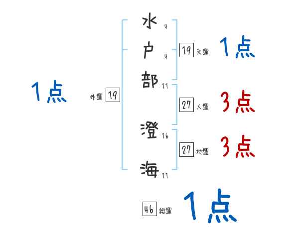 天運![]() | 水戸部澄海さんの天運は19画の1つ星!優れた才能を持ちますが、協調性が足りないことも。周りの人と協力する事を意識しましょう。 家系が持つ宿命的な運勢を表します。祖先から受け継いだ苗字ですので自分の力が及びません。家柄を象徴します。 |
