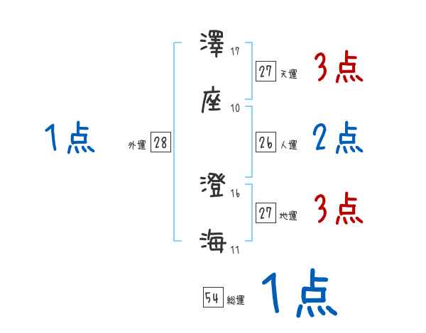 天運![]() | 澤座澄海さんの天運は27画の3つ星!頭脳明晰だが強情で摩擦が多い傾向。孤立に注意。 家系が持つ宿命的な運勢を表します。祖先から受け継いだ苗字ですので自分の力が及びません。家柄を象徴します。 |